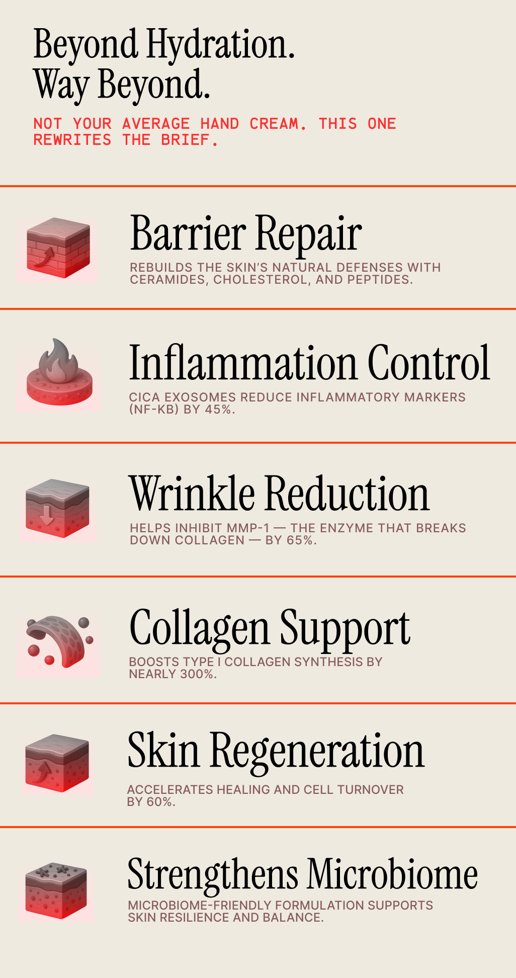 Indulgence meets biotech in a formula powered by Cica exosomes, peptides, and ceramides. Fast-absorbing, non-sticky, and deeply reparative, this cream is built for hands that move through more